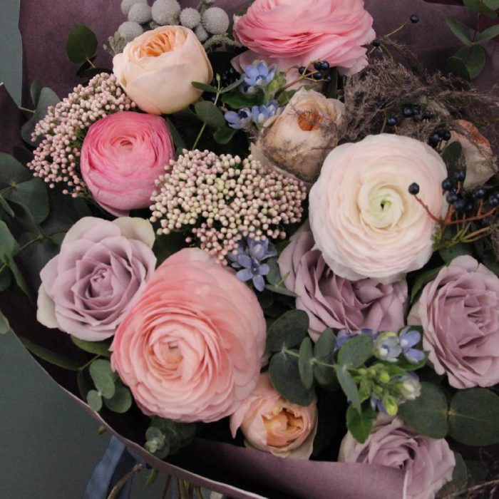 Ранункулюс – 4 шт.Роза Эквадор – 3 шт.Роза пионовидная дэвида остина – 3 шт.Твидия – 3 шт.Озотамнус – 2 шт.Бруния – 1 шт.Аспарагус – 2 шт.Эвкалипт – 7 шт.Вибурнум ягоды – 3 шт.Бумага – 3 шт.Лента атласная – 2 шт.