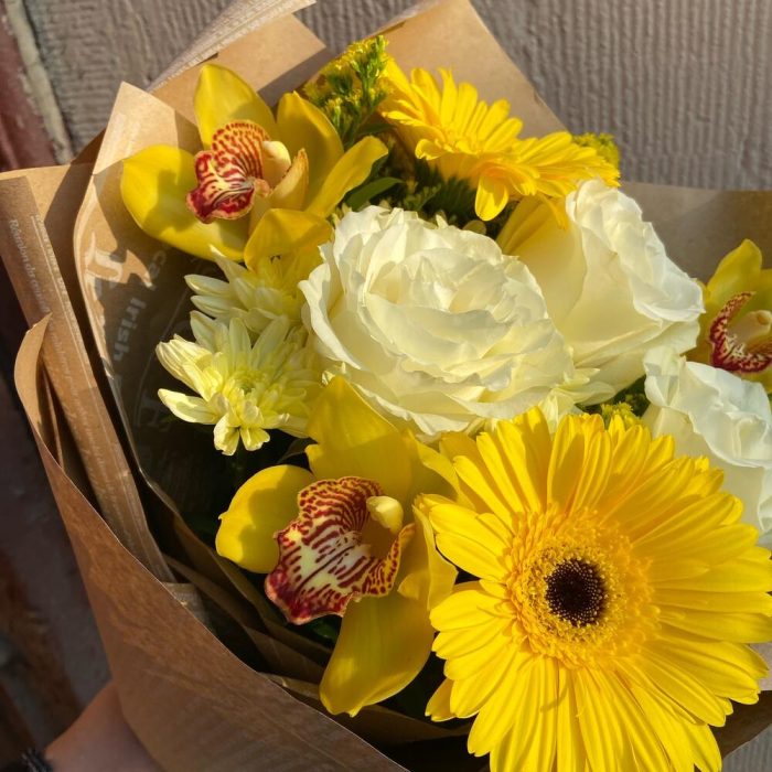 Гербера – 2 шт.Орхидея Цимбидиум – 3 шт.Рускус – 5 шт.Роза Эквадор – 3 шт.Солидаго – 3 шт.Хризантема кустовая – 2 шт.Упаковка дизайнерская – 5 шт.Лента атласная – 1 шт.