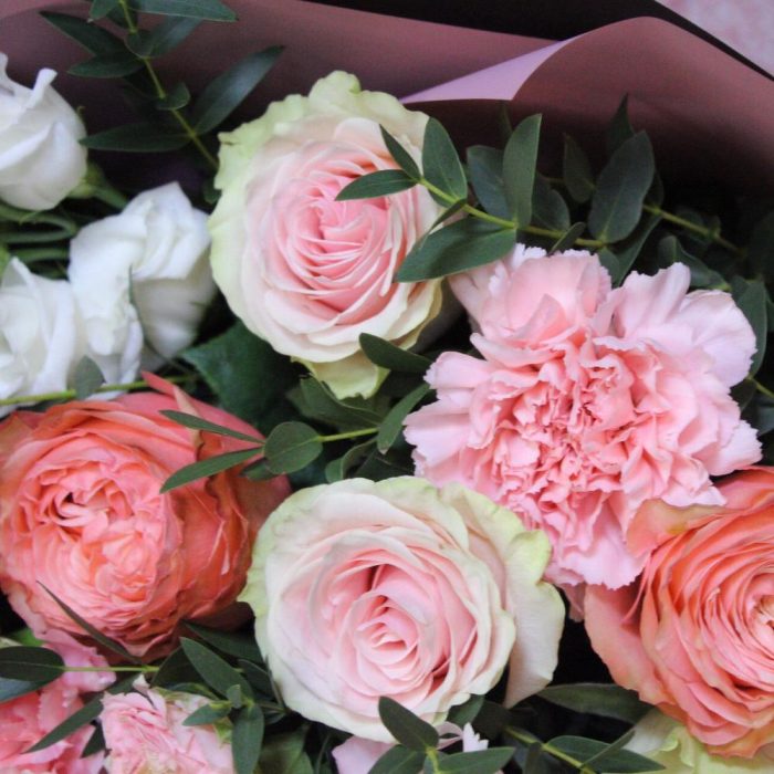 роза фруттето – 5 шт.Роза пионовидная кахала – 4 шт.Эустома – 3 шт.пионовидная кустовая роза мадам бомбастик – 2 шт.Диантус – 3 шт.Эвкалипт – 3 шт.Пленка матовая – 3 шт.Лента атласная – 2 шт.