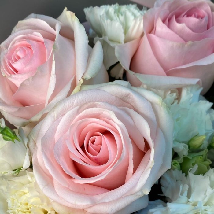 Роза Эквадор – 7 шт.Лизиантус – 4 шт.Диантус сортовой – 5 шт.Упаковка дизайнерская – 3 шт.Лента атласная – 1 шт.