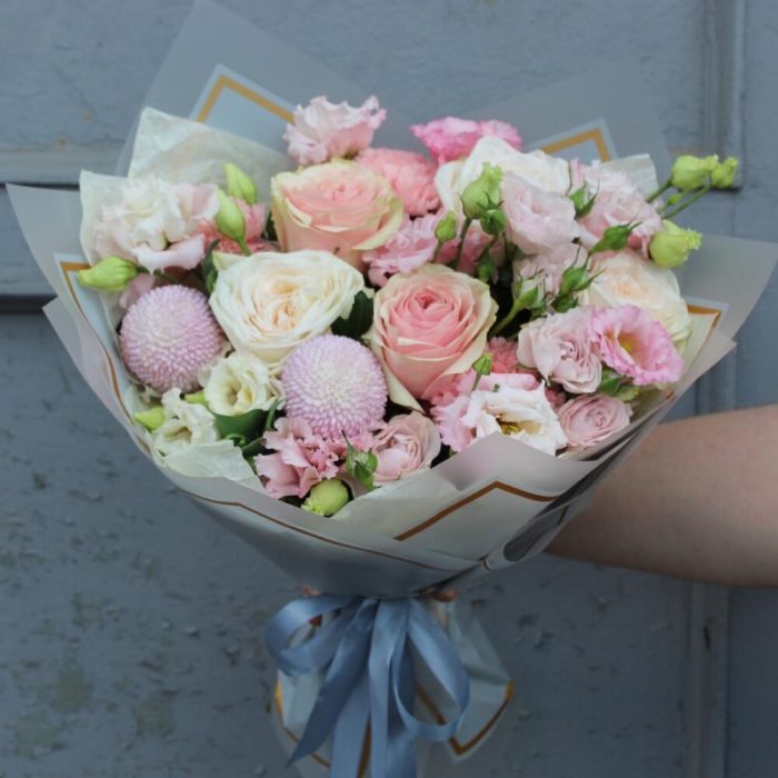 роза пионовидная вайт o’hara – 3 шт.роза фруттето – 2 шт.момоко – 2 шт.роза сортовая иноссенсия пинк – 1 шт.Диантус – 3 шт.эустома махровая селеб квин – 2 шт.Тишью – 3 шт.Пленка матовая – 2 шт.Лента атласная – 2 шт.