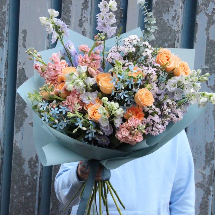Роза пионовидная кустовая – 3 шт.Твидия – 4 шт.Ваксфлауэр – 3 шт.Маттиола – 4 шт.Эвкалипт – 5 шт.Упаковка дизайнерская – 2 шт.Лента атласная – 2 шт.Астранция – 2 шт.Дельфиниум – 3 шт.