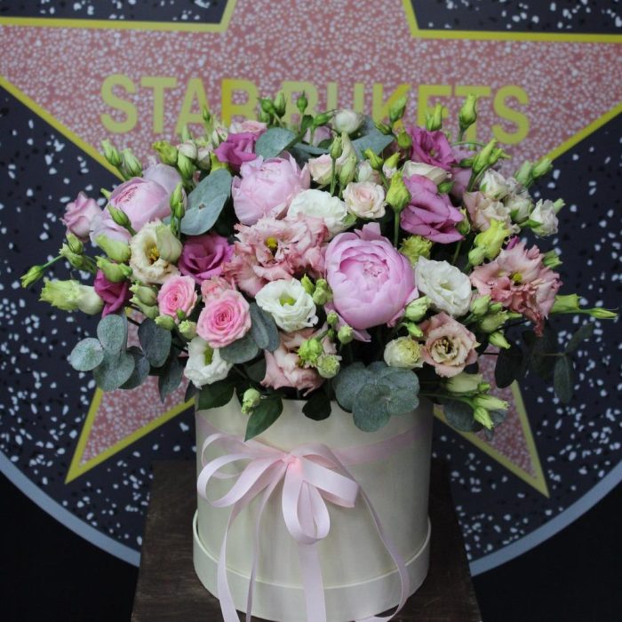 Эустома – 11 шт.Роза кустовая – 5 шт.Эвкалипт – 4 шт.Коробка шляпная – 1 шт.Оазис флористический – 2 шт.Лента атласная – 2 шт.Пион Сара Бернар – 5 шт.