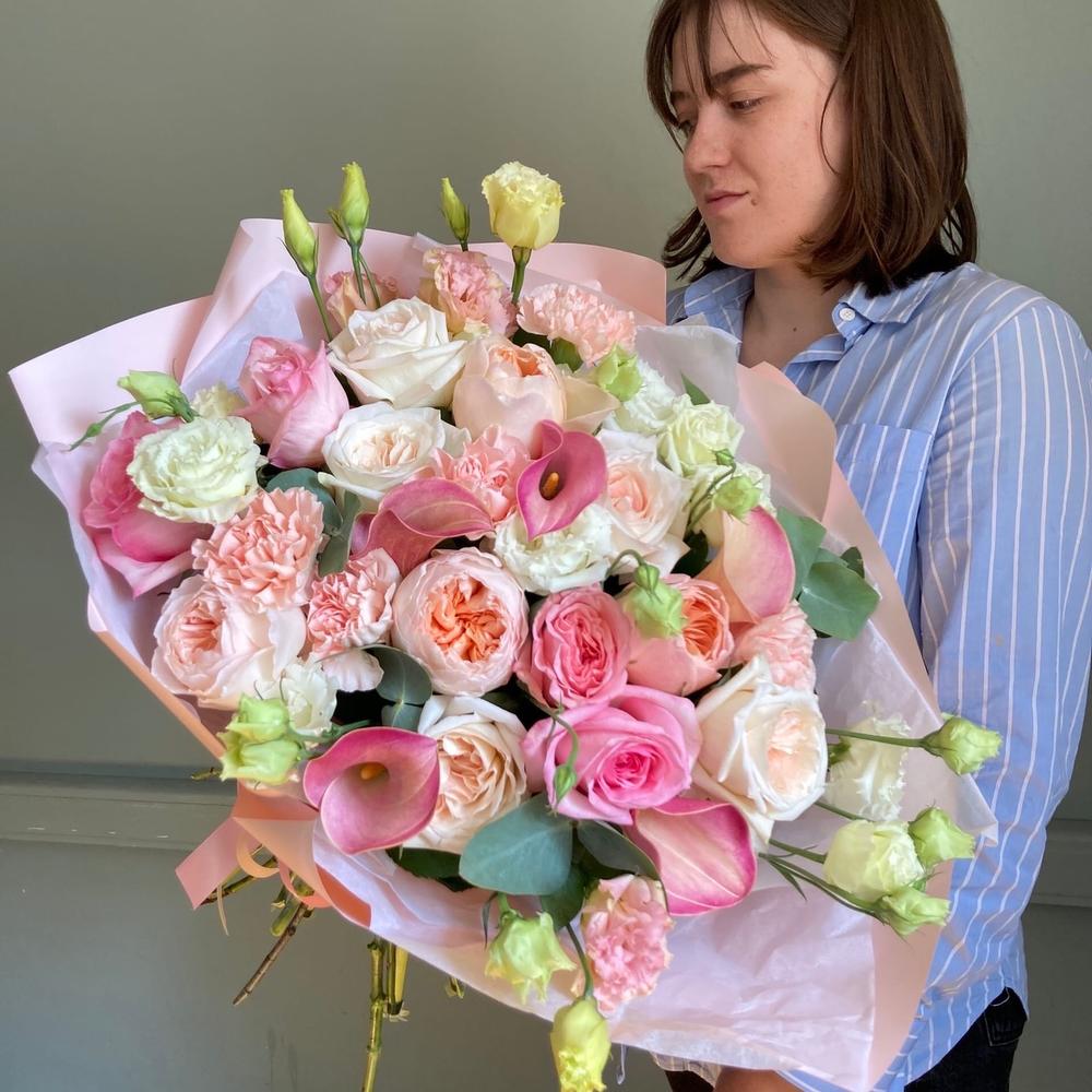 Авторский букет с пионовидными розами, каллами, лизиантусом, гвоздиками и эвкалиптом.Стильное цветочное решение для любого случая.