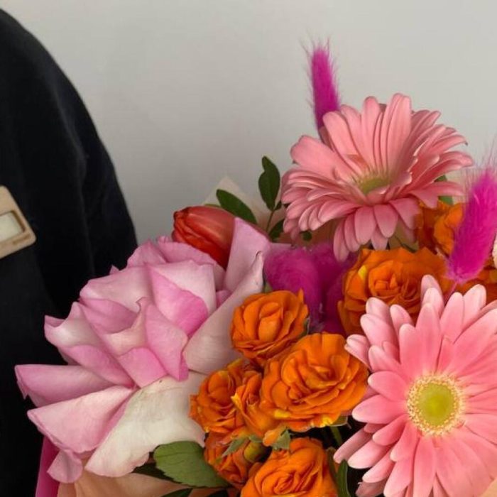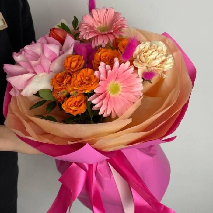Яркий букет из гербер и кустовых роз в дизайнерском оформлении