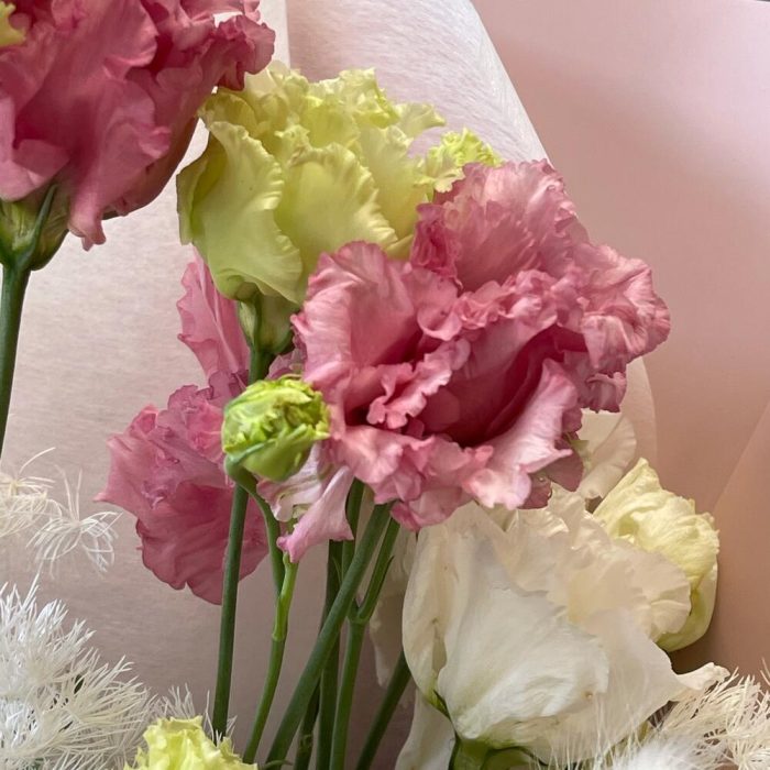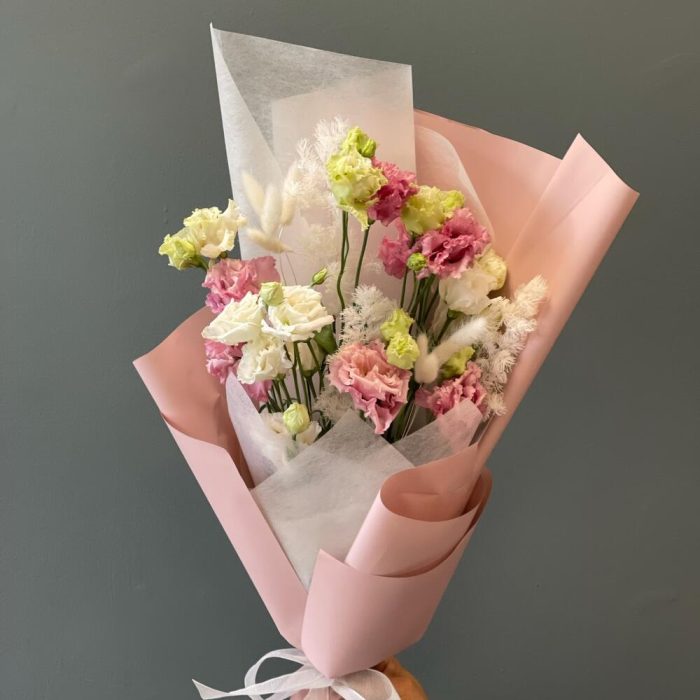 Букет из белых и розовых лизиантусов и сухоцветов “Нежное кружево”