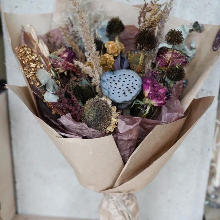 Астильба – 2 шт.Вероника – 1 шт.Целозия – 3 шт.Эвкалипт – 5 шт.Эрингиум – 3 шт.Сухоцветы – 5 шт.Упаковка дизайнерская – 1 шт.Нелумбо – 1 шт.Гелиантус – 2 шт.лекодендрон – 1 шт.розы – 3 шт.