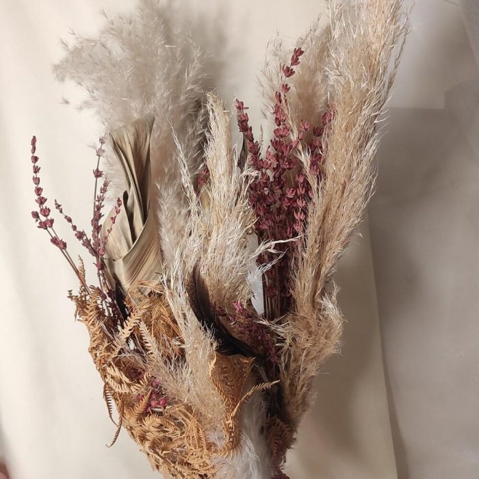 кортадерия – 4 шт.лаванда банч – 1 шт.перья фазан – 7 шт.Амми – 3 шт.карлина – 2 шт.пантус – 2 шт.папоротник стабилизированный – 5 шт.Перчик декоративный – 3 шт.Лента Кружево – 1 шт.