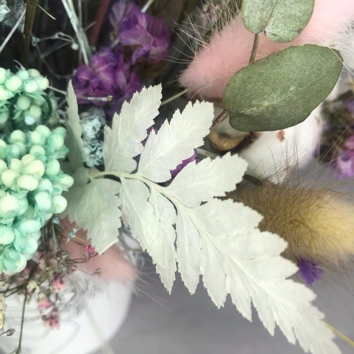 Хлопок натуральный – 7 шт.Лагурус (сухоцвет) – 25 шт.папоротник ветка – 5 шт.Ковыль – 1 шт.Краспедия – 7 шт.статица сухоцвет – 25 шт.сетария сухоцвет – 9 шт.гипсофила сухоцвет – 5 шт.пампасная трава – 2 шт.Кашпо – 1 шт.
