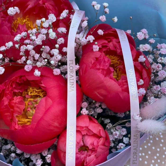Гипсофила – 5 шт.Пион Коралл Шарм (Coral Charm) – 5 шт.Лента атласная – 1 шт.Тишью – 2 шт.Лента брендированная – 1 шт.Лагурус (сухоцвет) – 6 шт.фламиран упаковка – 1 шт.