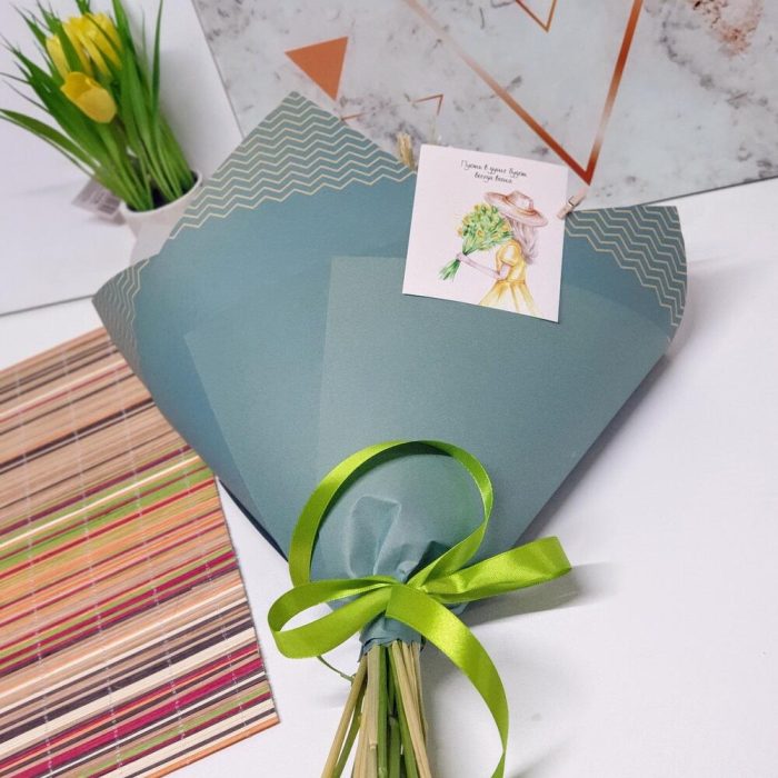 Лента атласная – 1 шт.Ромашка кустовая – 7 шт.Крафт упаковка – 1 шт.Открыточка с вашими пожеланиями – 1 шт.пленка матовая прозрачная – 1 шт.любовь флориста(бесплатно) – 1 шт.колоски пшеницы сухоцвет – 10 шт.