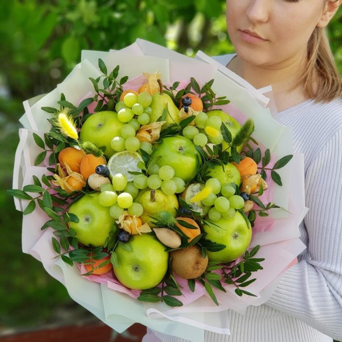 Виноград – 150 гр.Киви – 2 шт.Яблоко – 6 шт.Лайм – 2 шт.Физалис – 6 шт.Груша – 2 шт.Голубика – 15 гр.Лагурус – 5 шт.Транспортировочная коробка – 1 шт.Орех пекан – 5 шт.зелень фисташки – 3 шт.абрикос или мандарины – 6 шт.