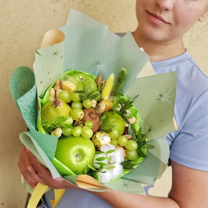 Виноград – 70 гр.Киви – 1 шт.Лайм – 1 шт.Груша – 1 шт.Миндаль – 10 гр.Арахис – 20 гр.коробка транспортировочная – 1 шт.грецкие орехи – 35 гр.яблоки – 2 шт.манговые конфеты – 2 шт.Конфеты Ferrero Rocher – 40 гр.орех макадамия в скорлупе – 1 шт.Хлопок – 1 шт.Лагурус (сухоцвет) – 2 шт.декоративная зелень – 1 шт.