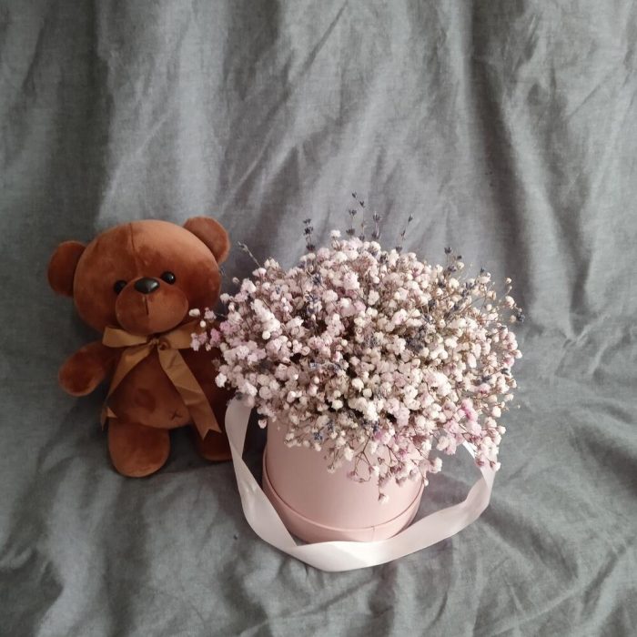 Гипсофила – 25 шт.Лаванда – 35 шт.Шляпная коробка – 1 шт.Подарочный пакет – 1 шт.