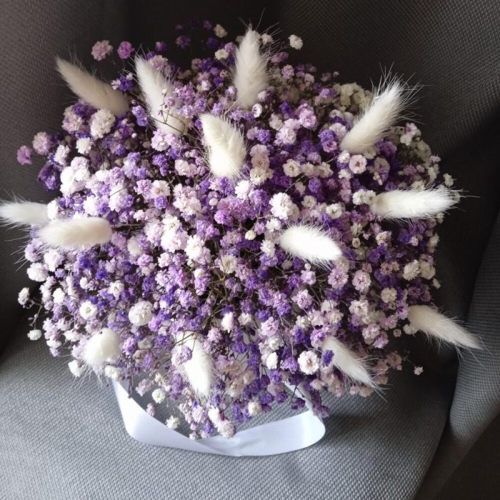 Гипсофила – 25 шт.Шляпная коробка – 1 шт.Лагурус – 15 шт.Флористическая губка – 1 шт.