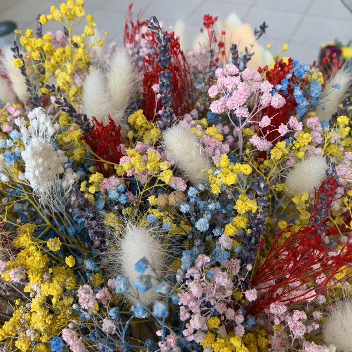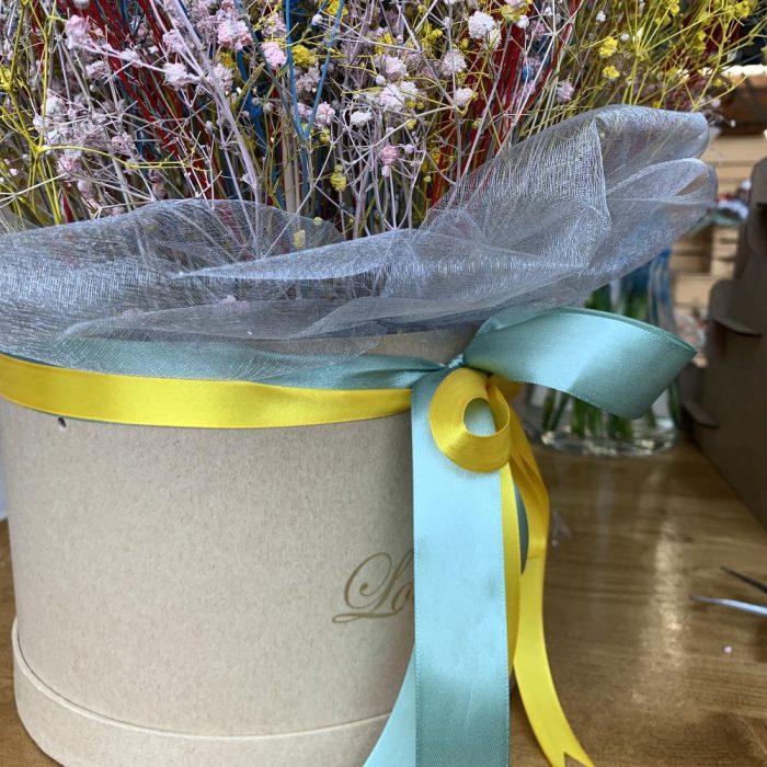 Шляпная коробка – 1 шт.Гипсофила крашеная – 15 шт.Лаванда – 20 шт.зайчики из лагуруса – 33 шт.Сухоцветы – 21 шт.