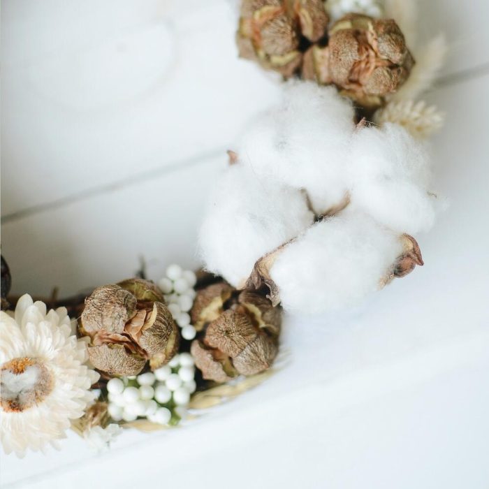Основа для венка – 1 шт.Хлопок – 1 шт.сухоцветы микс – 1 шт.ветка искусственная белая – 1 шт.Тишью – 1 шт.Коробка – 1 шт.