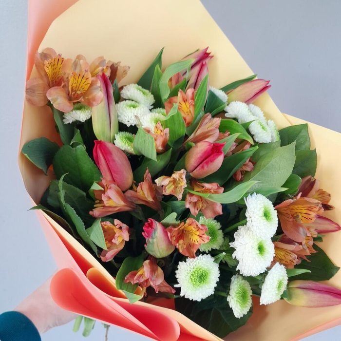 Букет из тюльпанов, альстромерии и сантини