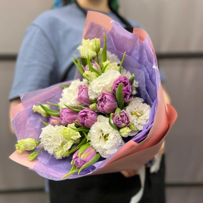 Тюльпан пионовидный – 9 шт.эустома махровая – 2 шт.Тишью – 2 шт.Пленка матовая – 2 шт.Лента атласная – 2 шт.