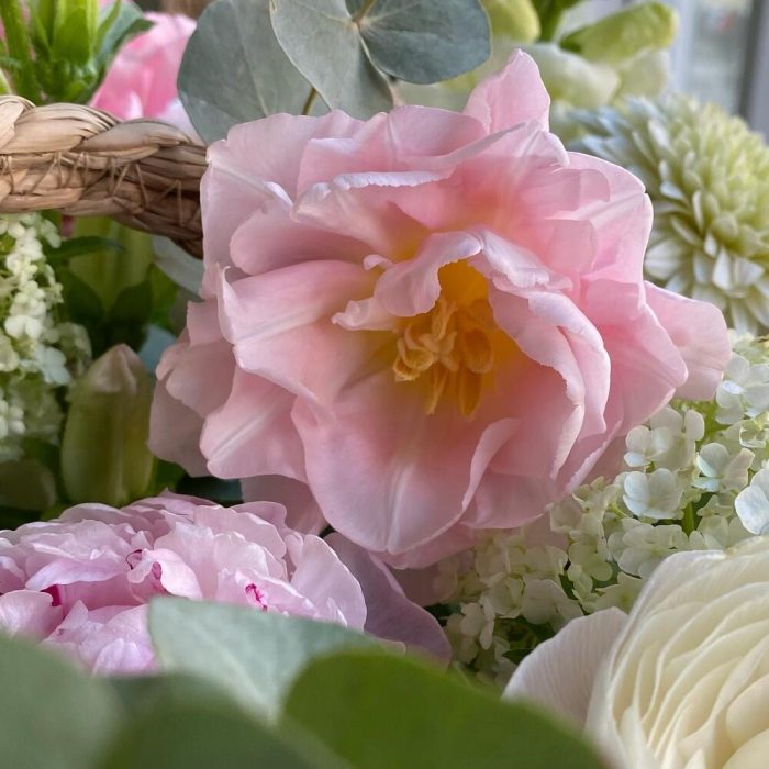 Вибурнум – 3 шт.Пион – 7 шт.Сирень – 3 шт.Тюльпан – 9 шт.Эвкалипт – 7 шт.Гербера – 3 шт.Ранункулюс – 5 шт.Корзина плетеная – 1 шт.Львиный зев – 3 шт.Колокольчик – 2 шт.Оазис флористический – 2 шт.