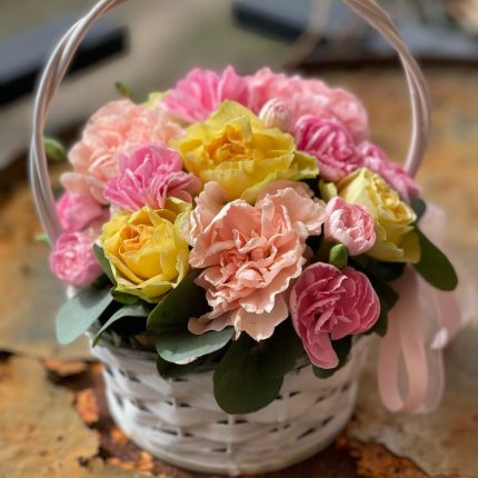 Корзина с цветами нежные розы с эвкалиптом на день рождения маме, сестре, подруге