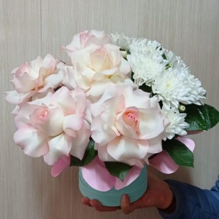 Хризантемы и Пионовидные кустовые розы в коробке + открытка ручной работы в подарок